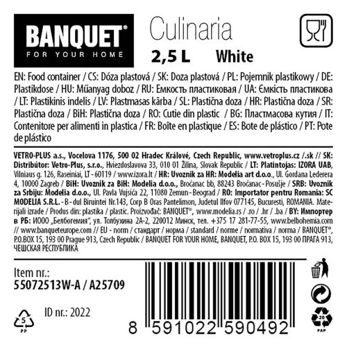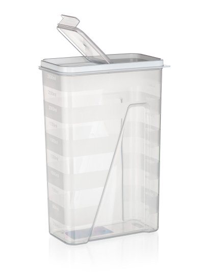Transparentná dávkovacia plastová dóza Culinaria s viečkom v bielej farbe. Dóza je praktickým pomocníkom na ukladanie cestovín, strukovín, múky a iných potravín. Vybavená meracou ryskou s odstupom 250 ml.
