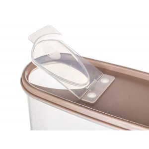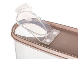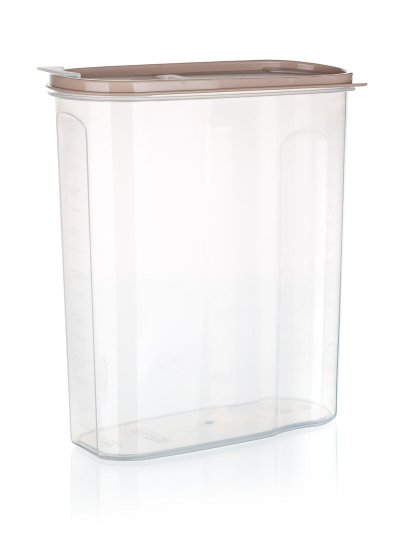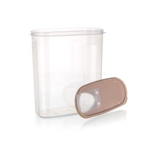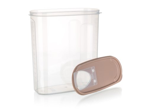 Transparentná plastová dóza RIVA s viečkom v hnedej farbe. Dóza je praktickým pomocníkom na ukladanie cestovín, strukovín, múky a iných potravín.