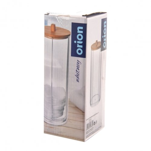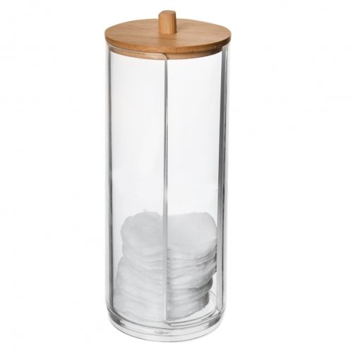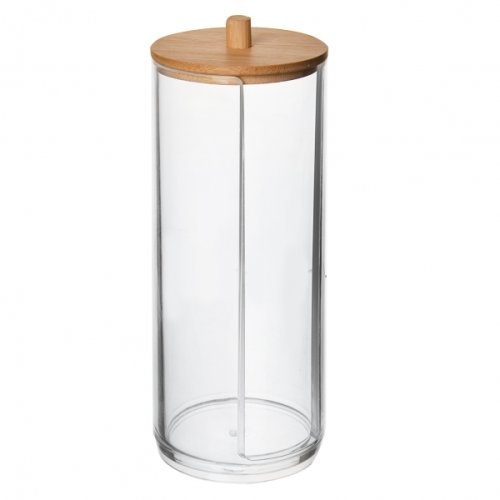 Dóza na vatové tampóny s viečkom. Praktický pomocník do kúpeľne. Ľahko sú vám k dispozícii, kúpeľňa zostáva uprataná. Materiál plast, bambusové drevo. Priemer 7 cm, výška 17.5 cm. EAN 8592381173609