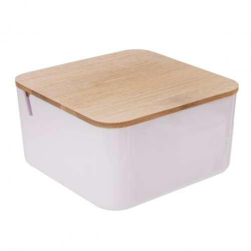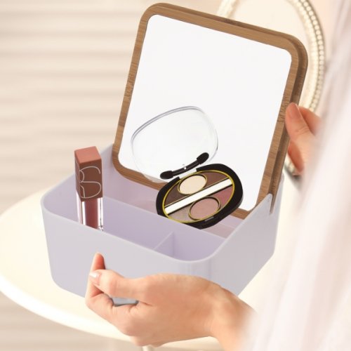 Dóza s viečkom na uloženie dekoratívnej kozmetiky. Na vnútornej strane viečka je zrkadlo, ktoré poskytuje možnosť nalíčenia tváre kdekoľvek, nielen v kúpeľni. Využijete ju doma aj na cestách. Materiál plast, bambusové drevo, sklo. Rozmery 14 x 14 x 7 cm. EAN 8592381170431