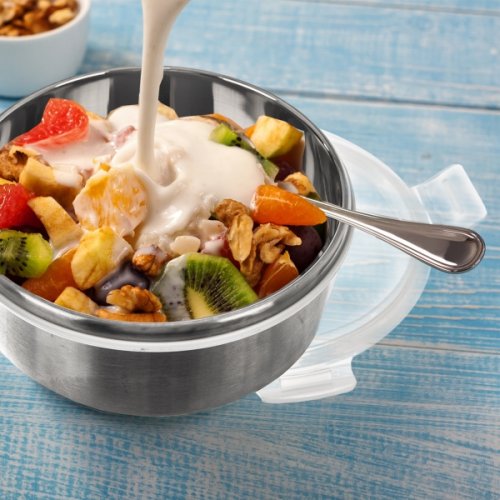 Nerezová miska s plastovým viečkom sa uzatvára na 4 pevné klipy. Vďaka tesneniu dózy dobre tesnia a sú vhodné nielen na uloženie potravín, ale aj na ich prenášanie/prevážanie. Materiál nerez, plast. Priemer 11 cm, výška 5 cm, objem 0.4 litra. Misku je možné umývať v umývačke riadu (bez viečka). EAN 8592381175986