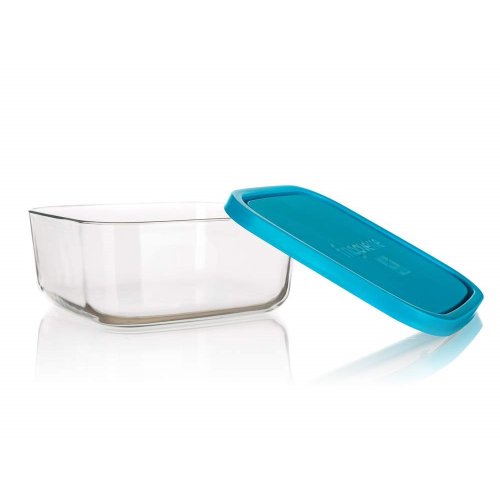 objem: 1 l rozmery: 15 x 15 x 5 cm materiál: sklo, polypropylénové viečko farba viečka: modrá