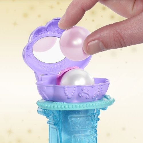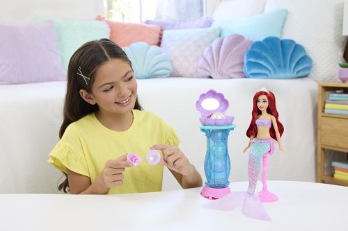 Herná súprava bábika Ariel s toaletným stolíkom je pripravená na dobrodružstvo so skrytými prekvapeniami a opakovateľnou hrou! Otvorte stolík a vynorí sa perla s prekvapivým doplnkom - celkom je ich 5! Perly je možné do toaletného stolíka znovu vložiť a hrať sa s nimi donekonečna. Set obsahuje módnu bábiku Ariel s odnímateľným chvostom z mäkkého materiálu v novom trblietavom vzhľade.