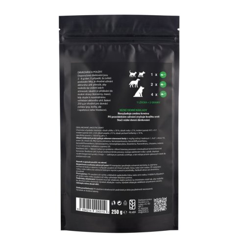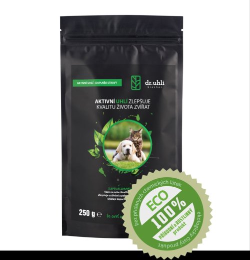Praktické balenie drveného biocharu vo forme prášku so zrnitosťou (frakcia) 0-1 mm, pre zdravie vašich domácich maznáčikov. Aktívne uhlie na seba viaže škodliviny a výsledkom je lepšia kondícia vašich miláčikov. Hmotnosť 250 gramov vystačí zhruba na 60 dní pre 30 kg psa.