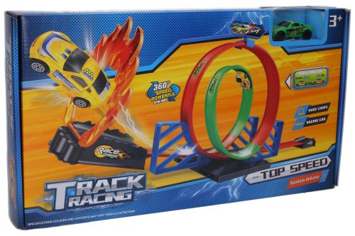Dráha so slučkou a ohnivou rampou. Rozmery zostavenej dráhy 100x22x27 cm. Obsahuje 1 auto na spätné natiahnutie. Schéma na zostavenie sa nachádza na zadnej strane obalu.