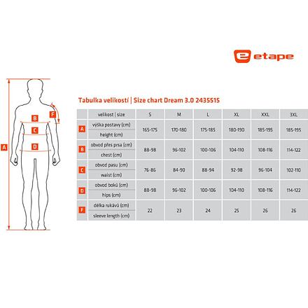 Pánsky cyklistický dres Etape Dream 3.0 ocení každý cyklista, či už na bicykli jazdí pravidelne alebo rekreačne. Dres s krátkym rukávom je vyrobený z elastického materiálu MicroCool - funkčný elastický materiál z polyesterových mikro vlákien, ktorý veľmi rýchlo schne, odvádza pot a vlhkosť od pokožky. Dres ďalej ponúka dlhý predný zips, panely z funkčnej elastickej sieťoviny AirMeshTM pre väčší komfort a 3 zadné vrecká na uloženie drobností. Vďaka použitým reflexným prvkom budete na ceste vždy dobre videný. Veľkostná tabuľka v obrázkoch. Uvedené hodnoty sú iba orientačné a vhodná veľkosť sa môže líšiť podľa konkrétneho typu postavy.