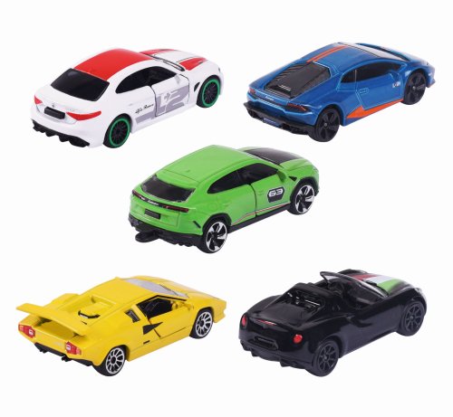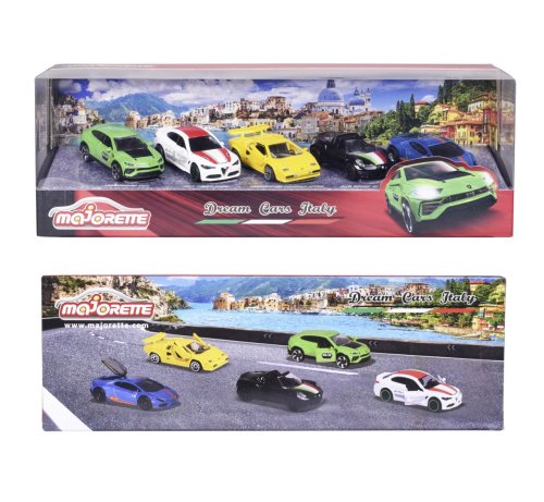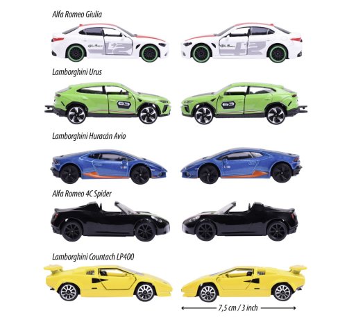 Darčeková sada 5 rôznych talianskych autíčok. Kovové autíčka na voľnobeh s otočnými kolesami, zavesením a kĺbovými časťami. Obsahuje Alfu Romeo 4C Spider, Lamborghini Countach LP 400, Lamborghini Huracán Avio, Lamborghini Urus, Alfu Romeo Giulia. Dĺžka 7,5 cm.
