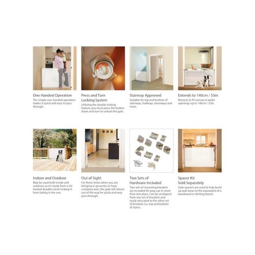 Táto zaťahovacia zábrana sa hodí pre otvory až do 140 cm a poskytuje praktickú bariéru pre všetky druhy rôznych šírok a keď sa nepoužíva, múdro sa zasunie späť. Jednoduché uvoľnenie a vypnutie spony vám umožní presunúť ho z jedného miesta na druhé, s 2 sadami montážnych konzol. Táto zábrana je vhodná na použitie v interiéri aj exteriéri. Je pevná a robustná. Tiež nepredstavuje nebezpečenstvo zakopnutia, takže je ideálny pre použitie na schodoch. Pokiaľ sa používa v exteriéri, odporúčame ju počas nepriaznivého počasia preniesť dovnútra.