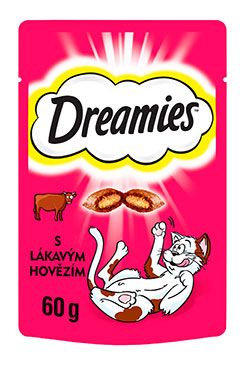 Dreamies chrumkavé vankúšiky plnené jemným krémom s hovädzou príchuťou. Mačky šalejú po neodolateľnej chuti mačacích maškrtiek DREAMIES. Lahodné a chrumkavé zvonku, mäkké vo vnútri – mačky jednoducho nedokážu odolať skvelej chuti DREAMIES. Tak len do toho, zatraste sáčkom a sledujte, ako sa k vám vaša mačka rozbehne.