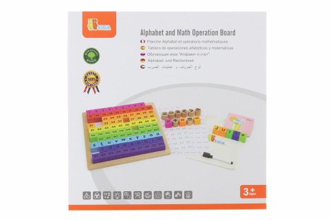 Drevená hra Abeceda a matematika. Sada obsahuje 100 kociek v desiatich farbách, 8 valcových kociek, 2 veľké papierové karty, 13 malých papierových kariet, látkové vrecúško a pero. Rozmery balenia cca 30 x 30 x 4,5 cm. Vek 3+