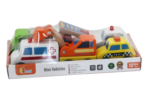 Sada 6 ks drevených autíčok - taxi,ambulance,bager,polícia,požiarne auto,nákladné auto.Rozmery auta cca 10 x 6 x 3 cm (podľa druhu). Rozmery balenia cca 25 x 7 x 12,5 cm. Vek 18m+