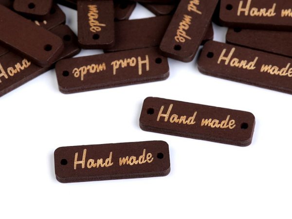 Drevenú ceduľku obdĺžnikového tvaru so zaoblenými rohmi zdobí jednostranný nápis "hand made".