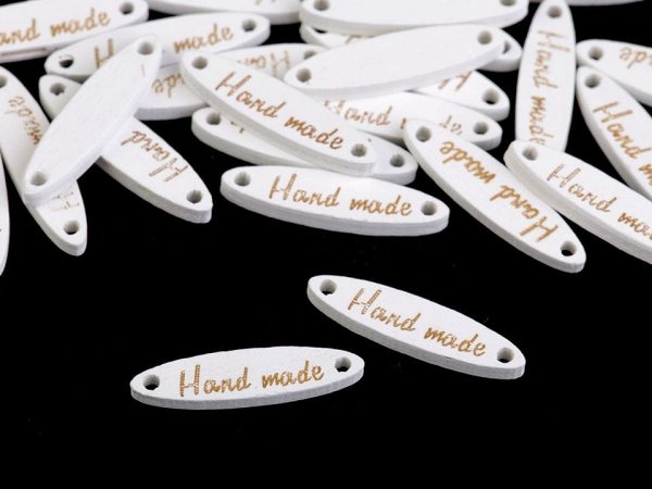 Drevenú ceduľku oválneho tvaru zdobí jednostranný nápis "hand made". Po stranách sú dierky, ktorými je možné prevliecť šnúrku a ceduľku tak zavesiť na dekoráciu. Použitie: Ceduľky môžete našiť ako štítok na ručne robené výrobky, napríklad tašky, puzdrá alebo ozdobné kvetináče. Sú vhodné aj na výrobu náramkov v kombinácii s korálkami alebo na kľúčenky. Svoje využitie určite nájdu aj pri scrapbookingu, kde s nimi môžete pomocou lepidla ozdobiť albumy, priania, menovky či zabaliť darčeky.