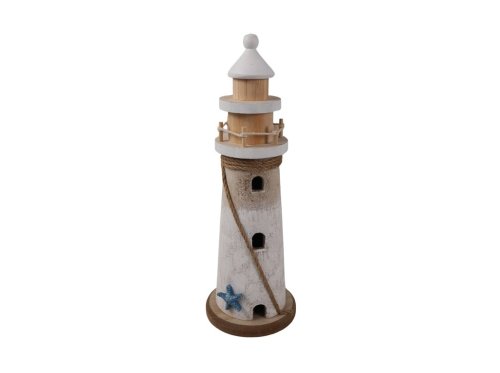 Tento drevený maják na postavenie v prírodnej, bielej a hnedej farbe je ideálny pre stolové dekorácie či celoročné aranžmány. Rozmery 100 × 300 mm umožňujú jeho ľahké umiestnenie na parapet, stôl či poličku. Štýlový dizajn dodáva interiéru útulnú a prírodnú atmosféru. Dekorácia je praktická a bezpečná, vhodná na kombináciu s ďalšími dekoratívnymi prvkami.