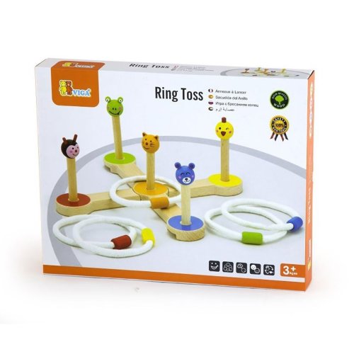 Rozkladacia hra na hádzanie krúžkov. Dva spôsoby spojenia dvoch základných dosiek pre väčšiu zábavu pri spoločnej hre. Obsahuje 2 základné dosky, 5 kolíkov s rôznymi roztomilými zvieratkami a 5 krúžkov s korálkami v rôznych farbách.