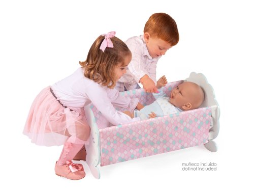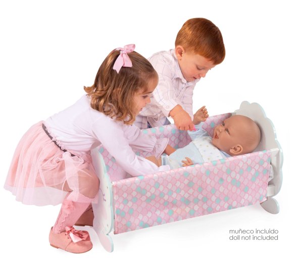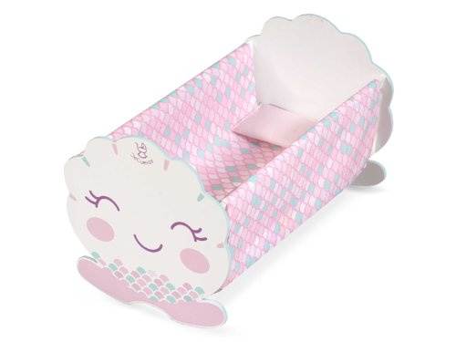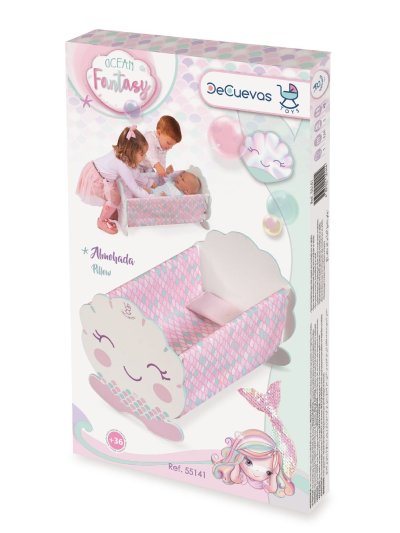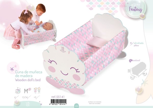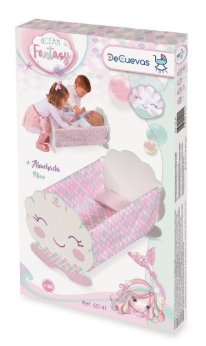 DeCuevas 55141 Drevená postieľky pre bábiky s doplnkami Ocean Fantasy 2021, z prekrásnej svetlo ružovej kolekcie s malou morskou vílou, iste zaujme svojim dizajnovým prevedením, ktoré je veľmi nápadité. Obe čelá kolísky sú v tvare morskej mušle, ktorý práve spinká. Vďaka svojim jemným pastelovým farbám je táto kolíska krásnym doplnkom dievčenskej izbičky.