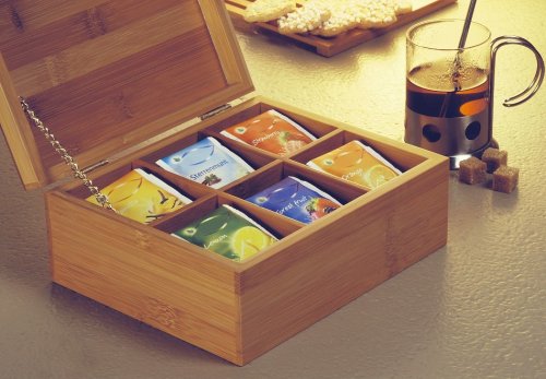 Čajová krabička TOM Krabička na čaj vyrobená z odolného bambusu na usporiadanie vášho čaju. Škatuľa má šesť priehradok. Špecifikácia: Farba: Kaukazská Materiál: Bambus Rozmery: 21,8 x 18 x 9 cm