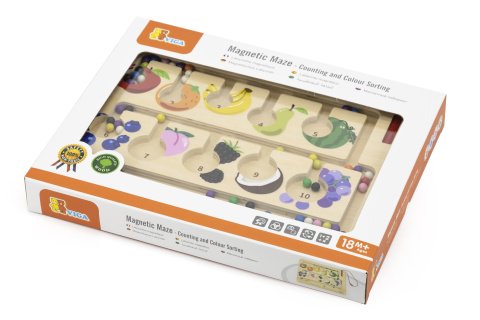 Drevená magnetická hra-labyrint. Pomocou magnetického pera sa posúvajú guličky v labyrinte. Rozvíja detskú zručnosť a učí farby. Rozmery balenia cca 31x24x4 cm. Vek 18m+