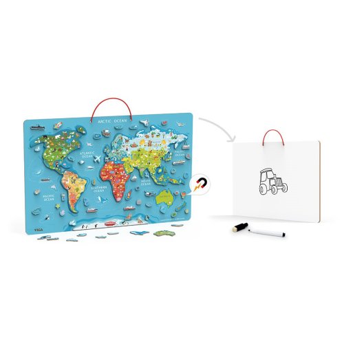 Magnetická Mapa sveta od spoločnosti Viga, ktorá je zároveň kresliacou tabuľou, je ideálnou hračkou pre malých objaviteľov, ktorí sa zaujímajú o svet!