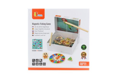 Drevená hra magnetické rybárčenie. Sada obsahuje 2 prúty, 26 rybičiek a 14 samolepiek. Rozmery balenia cca 21x21x7 cm. Vek 18m+