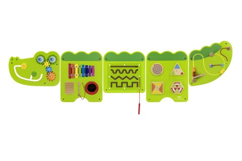 Drevená nástenná hra Krokodíl - junior. Nástenná hra obsahuje herné prvky ako napr. xylofón, magnetické bludisko alebo ozubené kolieska. Rozmery hry 180x50, 5x5, 5 cm. Rozmery balenia 45x23x36 cm. Vek 18m+