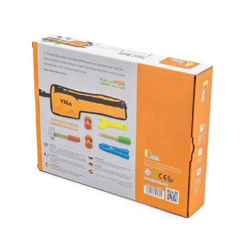 Robustný pásik s náradím, pripevnený plastovou sponou/prackou s možnosťou nastavenia - umožňuje prispôsobenie detskej postave. Opasok má priestranné vrecko na skrutky a rôzne drobnosti a tiež špeciálne pútka na náradie.