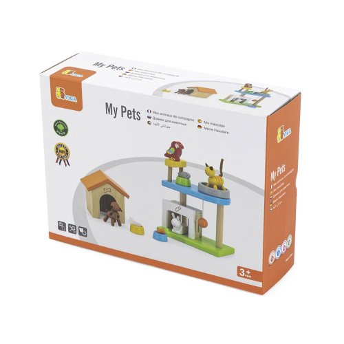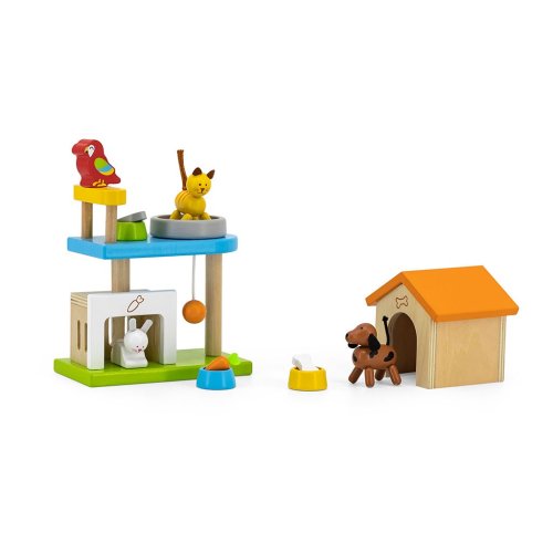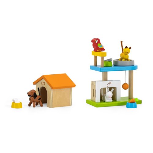 Sada sa skladá zo 4 drevených figúrok predstavujúcich domáce zvieratá (pes, mačka, králik, papagáj), doplnkov na kŕmenie (misky a jedlo) a spanie (búda pre psa, domček pre králika, pelech pre mačku a palicu pre papagája).
