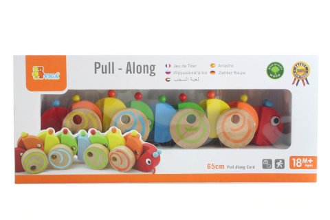 Drevená ťahačka húsenica o rozmere cca 30 x 7 cm. Rozmery balenia cca 37 x 16 x 7 cm. Vek 18m+