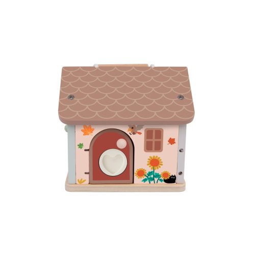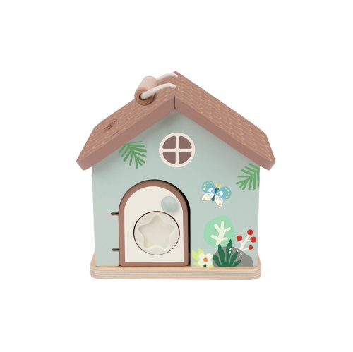 Objavuj svet vo vnútri malebného dreveného domčeka! Táto krásna vkladačka ponúka deťom 11 dielikov na preskúmanie a vkladanie – postavičky, zvieratká i drobnosti z domácnosti. Deti si rozvíjajú jemnú motoriku, učia sa koordinácii ruky a oka a trénujú trpezlivosť pri vkladaní jednotlivých prvkov na správne miesto. Vďaka praktickému držadlu na streche si domček môžu ľahko prenášať. Jemné farby a ilustrácie podnecujú fantáziu a radosť z hry. Veľkosť hračky cca 16×15×14 cm Vhodné pre deti od 18 mesiacov.