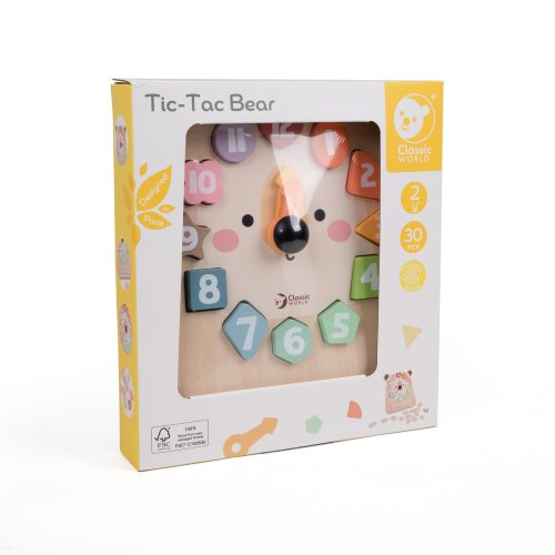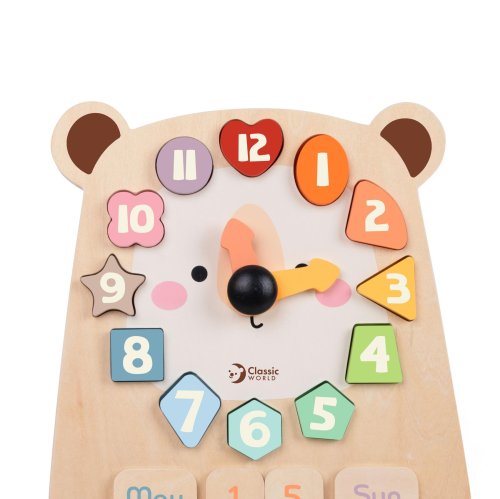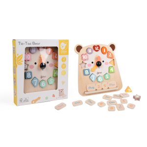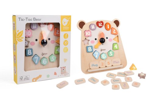 Roztomilé drevené hodiny s motívom medveďa pomáhajú deťom zábavnou formou naučiť sa poznávať čas. Farebná vkladačka s číslami rozvíja jemnú motoriku, logické myslenie aj koordináciu ruky a oka. Otáčavé ručičky umožňujú jednoduché precvičovanie hodín, zatiaľ čo jednotlivé dieliky s číslami je možné používať aj samostatne pri hre alebo počítaní. Hračka je vyrobená z kvalitného dreva a má veselý design, ktorý zaujme každé dieťa. Rozmery balenia: 26 cm x 29 x 5cm Vhodné pre deti od 24 mesiacov.