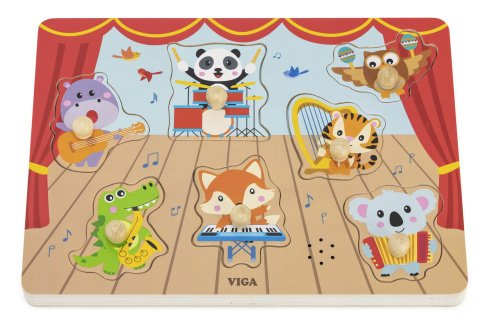 Drevená vkladačka zvieratka a hudobné nátroje. Napájanie na 2xAAA batérie, ktoré nie sú súčasťou balenia. Pri správnom vložení sa ozve zvuk daného hudobného nástroja. Rozmery 30x22x1, 5 cm. Vek 18m+