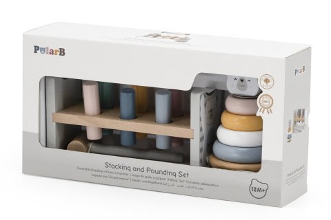 Drevená sada pre najmenších obsahuje zatĺkačku a skladaciu pyramídu s motívom ľadového medveďa. Rozmery zatĺkačky 20,3x7,2x10,4 cm, rozmery pyramídy 8,2x8,2x13 cm. Rozmery balenia cca 34x18x9 cm. Vek 12m+