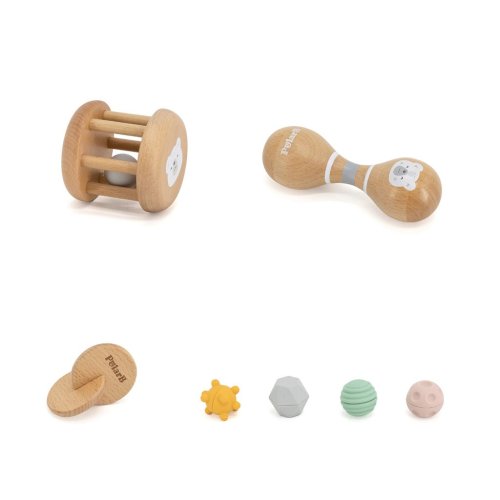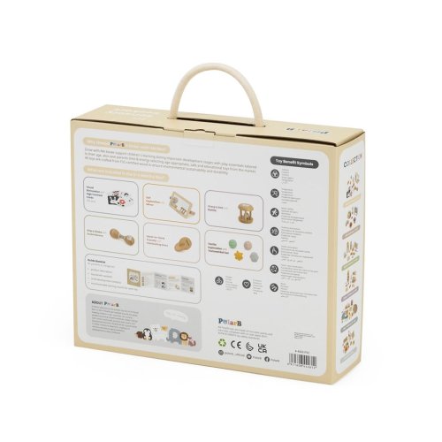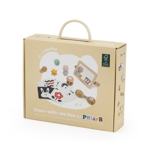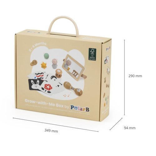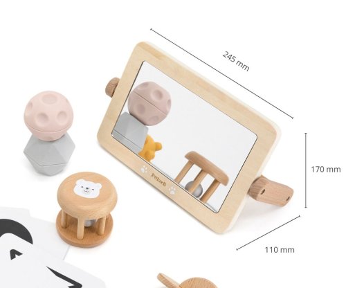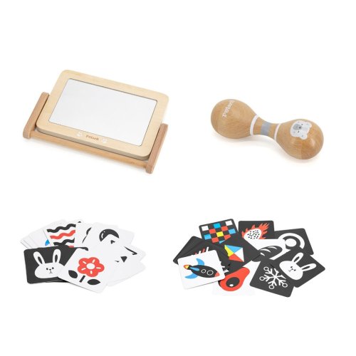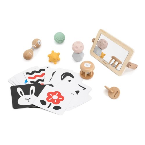 Box s aktivitami pre najmenšie deti. Balenie obsahuje zrkadlo, kartičky s obrázkami, senzorické loptičky, rumbaguľu a 2 drevené hlavolamy. Rozmery balenia 35x29,5x10 cm. Vek 0-6 mesiacov