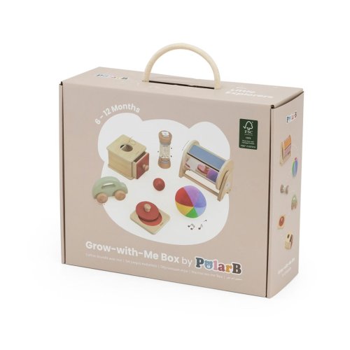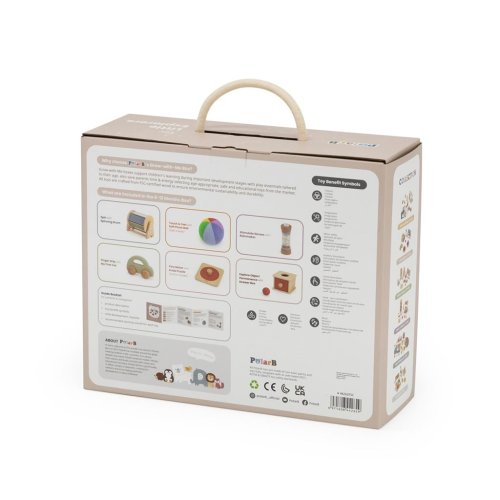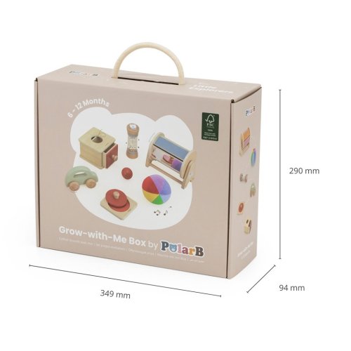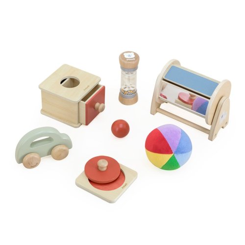 Box s drevenými aktivitami. Box obsahuje 4 drevené aktivity pre deti, drevené autíčko a látkovú loptičku. Všetko pre rozvoj jemnej motoriky. Rozmery balenia 35x30x12,5 cm. Vek 6-12m