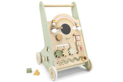 Drevené chodítko s hernými prvkami na rozvíjanie detskej chôdze a motoriky. Rozmery cca 31,4 x 39,3 x 51 cm. Obsahuje prevliekačku, vkladačku, ozubené kolieska a otáčacie hračky. Rozmery balenia cca 36 x 50 x 8,5 cm. Vek 12m+