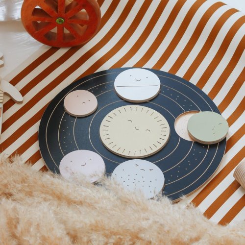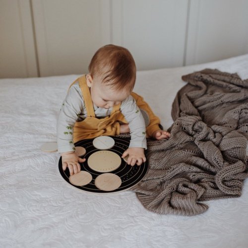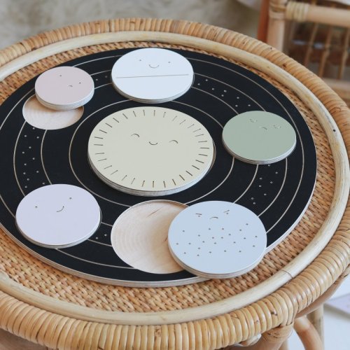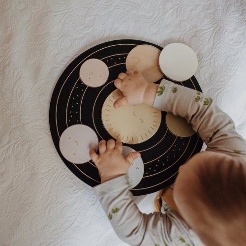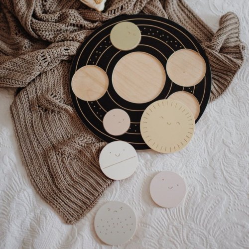 Drevený kruh s vyrezanými, rôzne veľkými priehlbinami. Úlohou dieťaťa je priradiť 6 planét do príslušných otvorov.