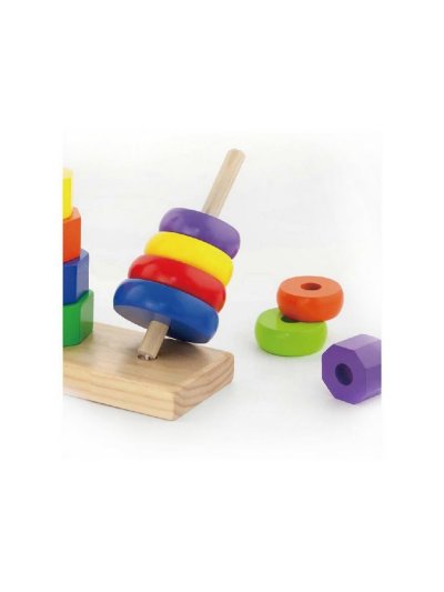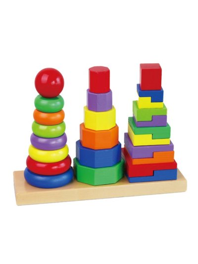 Farebné pyramídy Viga. Súprava obsahuje 3 pyramídy, ktoré sú umiestnené na drevenom podstavci. Dieťa musí umiestniť správny tvar na správne miesto av správnom poradí, aby vytvorilo vežu. Každá z nich má iný geometrický podstavec. Hračka je vyrobená z lakovaného dreva. Našou prioritou je bezpečnosť a kvalita našich výrobkov, a preto farby použité na hračkách nie sú toxické a spĺňajú bezpečnostné štandardy (EN71 a ASTM). Pre deti od 12 mesiacov.