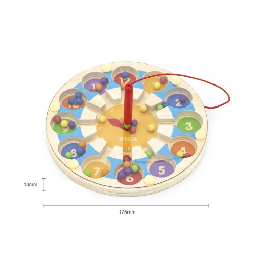Drevená hra - hodiny. pomocou tyčky vkladáte magnetické guličky na správnej pozície. Podporuje učenie. Rozmery hodín 17,5x1,5 cm. Rozmery balenia 21x21x4 cm. Vek 18m+