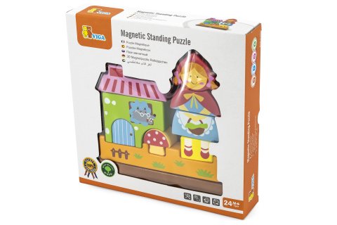 Drevené magnetické kocky - stavebnica s motívom Červenej Čiapočky. Rozmery stavebnice 20x20x4, 5 cm. Rozmery balenia 26x26x5,5 cm. Vek 24m+