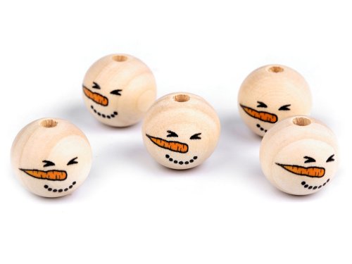 Drevené korálky s maľovanou tvárou snehuliaka. S ich pomocou si môžete vytvoriť postavičky, vytvoriť veselý náhrdelník, vyrobiť prstové maňušky, veselé zápichy do kvetináča a pod. Vďaka maľbe sa od seba jednotlivé korálky môžu líšiť. Môže sa líšiť aj kresba dreva, vrátane farby. Vzhľadom na technológiu spracovania dreva môžu byť okolo prievlakov otrepky. Tvár je na prednej strane korálku, zadná strana je bez maľby. Korálky č.1 a 3 sa vďaka laku jemne lesknú, korálky č.2 a 4 sú prírodné.