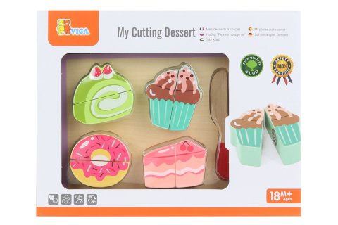 Táto sada na krájanie torty obsahuje 4 lahodné dezerty, ktoré možno nakrájať na 8 častí pomocou dreveného noža, a tácku, ktorú možno prevrátiť a použiť ako doštičku. Drevené koláčiky držia pohromade suchým zipsom a dajú sa zladiť v zodpovedajúcej drážke. Vynikajúci doplnok každej popoludňajšej čajovej súpravy alebo hracej kuchynky. Rozmer balenia cca 27 x 21 x 3,5 cm. Vek 18m+
