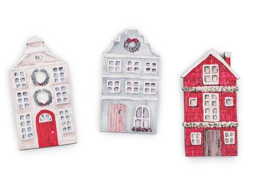 Súprava drevených mini domčekov je vhodná na celoročné aranžovanie. Na prednej strane majú potlač, zadná strana je drevená. Dajú sa prilepiť na veniec, kvetináč aj kvetináč alebo na špajli na vytvorenie zápichu. Môžete ich tiež využiť na ozdobenie prianí a darčekov. V neposlednom rade môžu byť aj krásnou vianočnou dekoráciou na stromček, stačí k nim prilepiť šnúrku na zavesenie. Súprava obsahuje 3 typy domčekov po 4 kusoch.