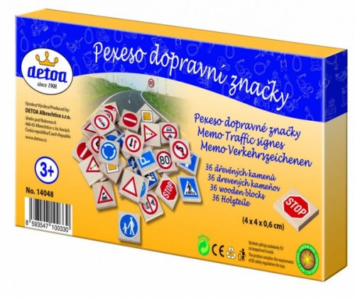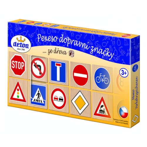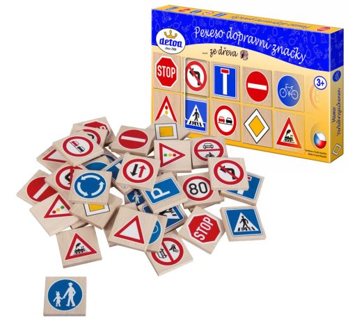 Zábavné spoznávanie obrázkov dopravných značiek. Napomôže zdokonaľovať znalosť dopravných značiek a zároveň si zahrať pexeso. Veľkosť drevených kartičiek 165x125x15mm. Balenie obsahuje 36 dielikov.