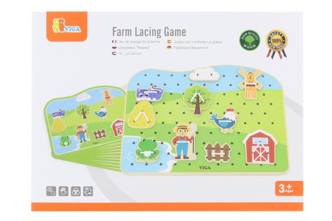 Táto navliekacia hračka s motívom farmy obsahuje drevenú hraciu dosku, 20 navliekacích doštičiek, 3 nite a 10 kariet so šablónami, ktoré ukazujú rôzne spôsoby navliekania doplnkov na dosku. Deti môžu tiež vytvárať neobmedzené scény prostredníctvom svojej fantázie. Pomáha trénovať jemnú motoriku, schopnosť rozpoznávania tvarov, priestorovú orientáciu a koordináciu oko-ruka. rozmer hracej dosky cca 30,5 x 22,6 x 4 cm. Rozmer balenia cca 30,5 x 22,5 x 4 cm. Vek 3+
