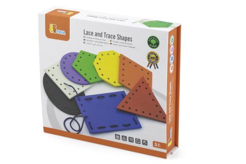 Drevené prevliekanie tvarov. Balenie obsahuje 8 doštičiek s tvarmi a šnúrkami. Rozmery balenia cca 20,5x19x4,5 cm. Vek 3+