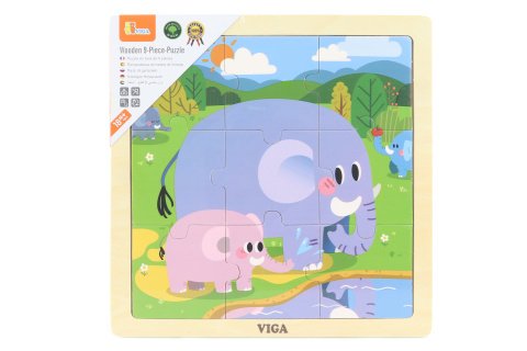 Drevené puzzle 9 dielikov s obrázkom slonov. Rozmer drevenej dosky cca 22 x 22 x 1 cm. Rozmer balenia cca 22 x 22 x 1 cm. Vek 18m+