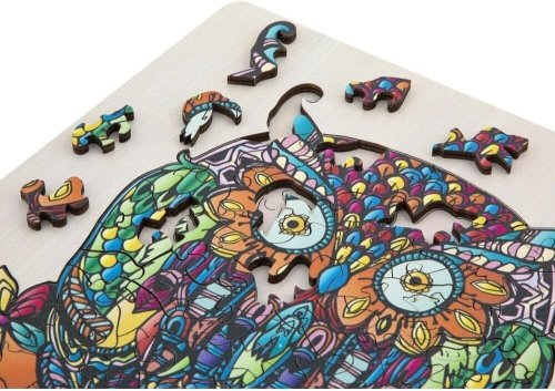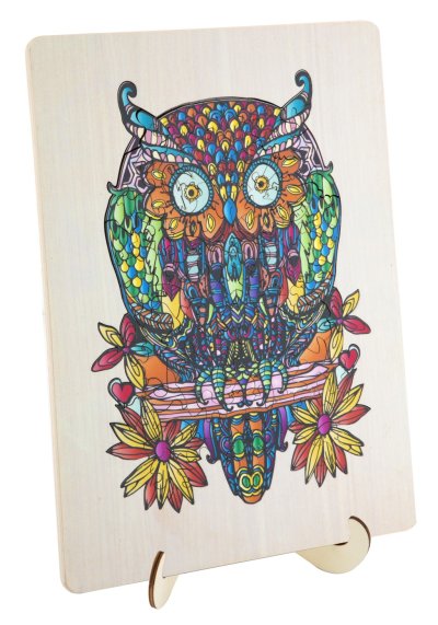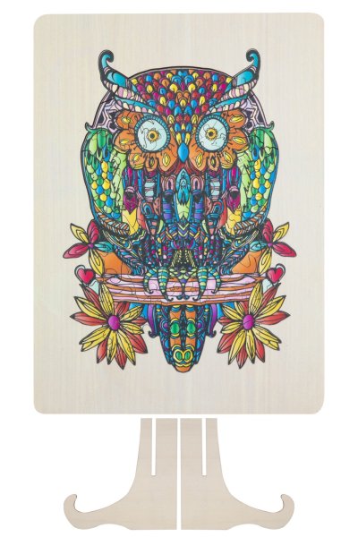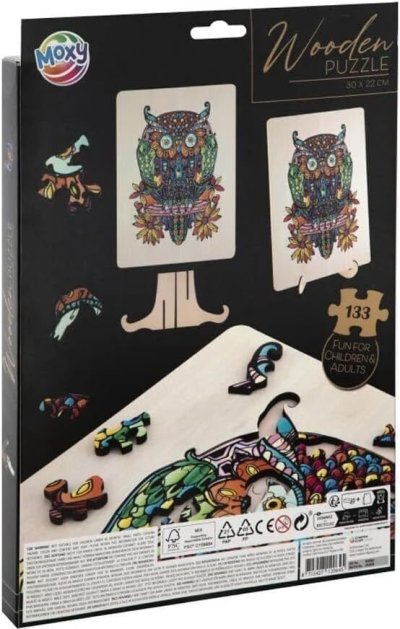 Drevené mozaikové puzzle so stojanom v dizajne Sova. Puzzle sa skladajú zo 132 jedinečne tvarovaných dielikov a zložené puzzle je možné potom umiestniť na priložený drevený stojan. Rozmery: 30 × 22 centimetrov. Vhodné od 7 rokov.