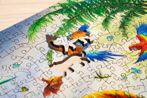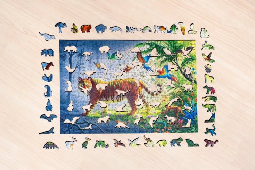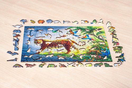 Zažite neporovnateľnú zábavu pri skladaní vysoko kvalitného dreveného puzzle s motívom tigra v džungli od spoločnosti Ravensburger. Jedinečné dieliky puzzle do seba perfektne zapadajú. Tieto unikátne puzzle sú vyrobené z dreva, na ktorom je vytvorená vysoko kvalitná farebná potlač. Každý dielik má úplne unikátny tvar. Nájdete tu dieliky, ktoré vyzerajú ako skutočné zvieratá, kvety a iné predmety z reálneho života. Ďalej tu nájdete aj dieliky abstraktných tvarov. Pri skladaní tohto dreveného puzzle uvoľníte myseľ a skvele sa odreagujete. Vyrobené v Európe.