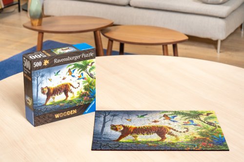 Zažite neporovnateľnú zábavu pri skladaní vysoko kvalitného dreveného puzzle s motívom tigra v džungli od spoločnosti Ravensburger.