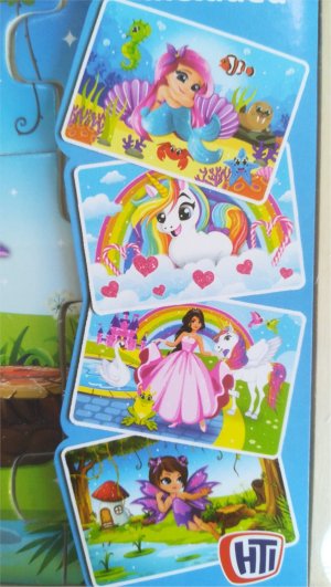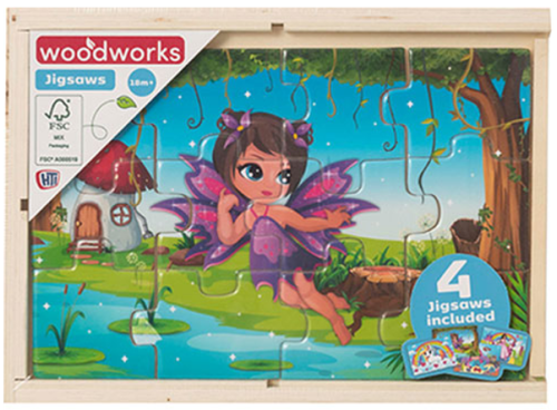 Štyri samostatné drevené puzzle po 12 dielikoch v drevenej krabičke s vekom. Veko slúži zároveň ako podložka na skladanie. Rozmer zloženého puzzle cca 17 x 11,5 cm